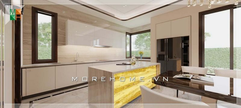 Mẫu thiết kế phòng bếp dành cho các căn hộ chung cư, biệt thự, nhà phố được thiết kế bằng đá nhân tạo có màu trắng vân vàng đẹp mắt.