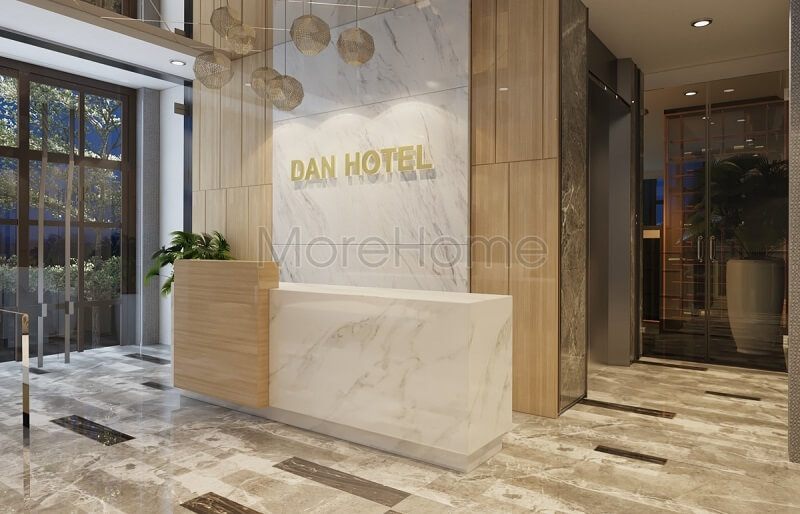 Quầy lễ tân khách sạn được thiết kế sang trọng với sự sử dụng của gạch lát nền cao cấp, bức tường đá vân mây màu trắng làm nổi bật và cuốn hút mọi ánh nhìn.